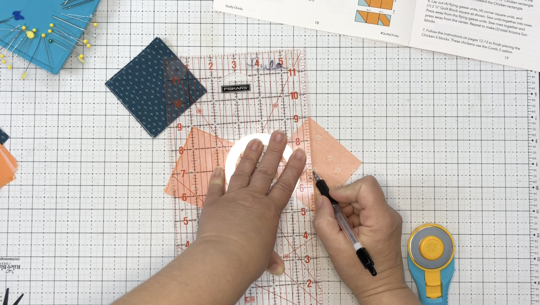 2. Draw a line from corner to corner on the lighter of the 3” squares using a ruler and pen/pencil. Pair Chicken and Quilt Block fabric squares.